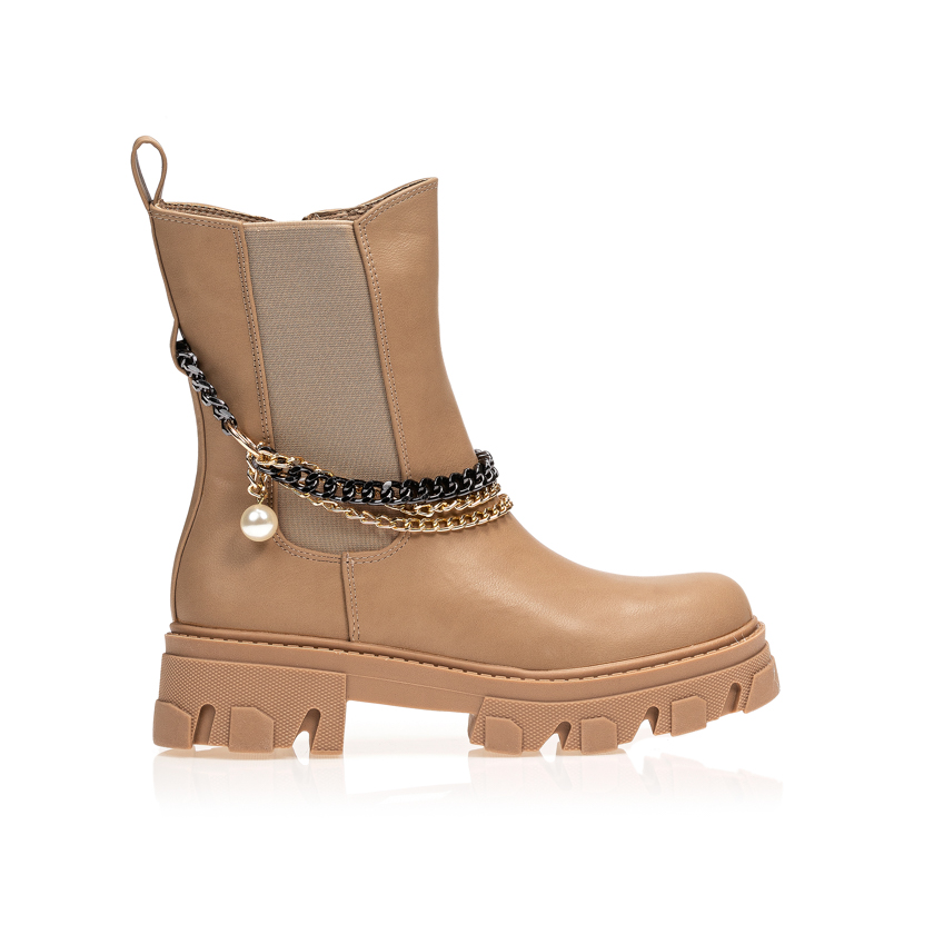 Μποτάκια δερματίνη σε πούρο χρώμα με λάστιχο στο πλάι. Διακοσμητικές αλυσίδες σε μαύρο και χρυσό χρώμα και διακοσμητική πέρλα. Φερμουάρ στο πλάι.Ύψος σόλας 4,5 cm.Κωδικός: 4616125kh